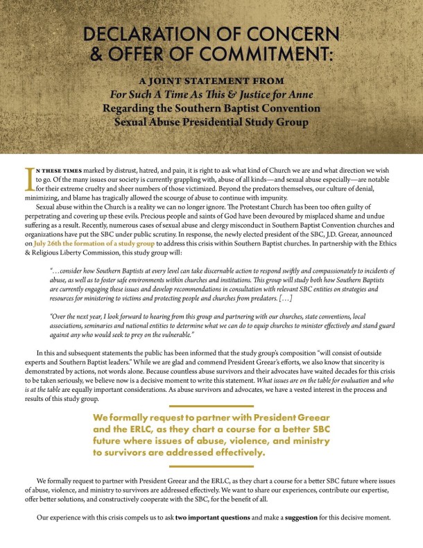 “If you please, read the joint statement myself and fellow abuse survivors and advocates delivered to the president of the Southern Baptist Convention (SBC) yesterday regarding their announcement of a sexual abuse study group: